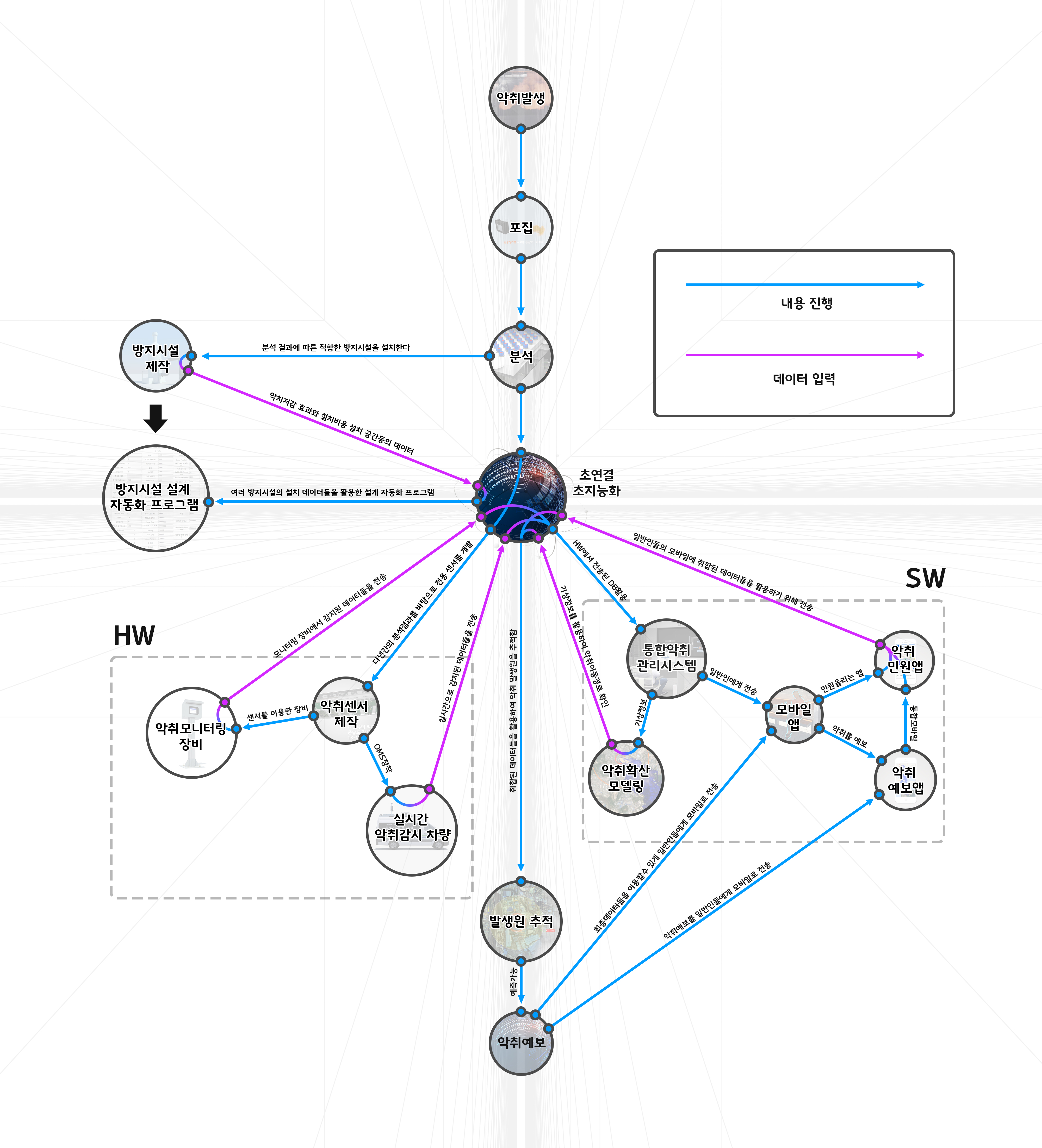 실시간으로 감지된 악취 데이터들은, 초연결 시스템을 통해 통합 관리 시스템으로 전송되며, 전송된 데이터를 바탕으로 초지능화 시스템을 거쳐 악취 발생과 확산에 대한 정확한 대처를 진행 합니다.